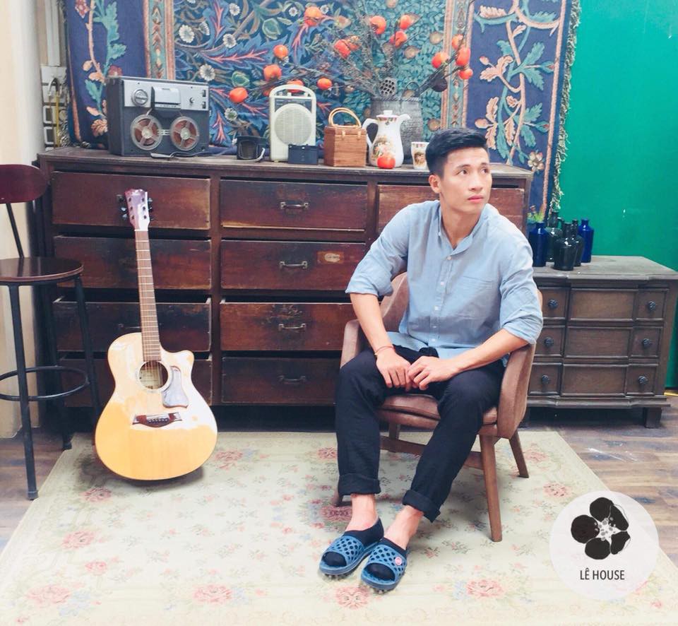 Tiến Dũng còn trổ tài chơi guitar nữa nhé. Nhìn anh chàng có vẻ rất hứng thú với nhạc cụ gắn với những người lính ngày xưa.