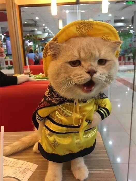 ![]() ![]() ![]() Chú mèo diện bộ trang phục hoàng thượng ung dung ngồi bán hàng khiến mọi người không nhịn cười được. |
