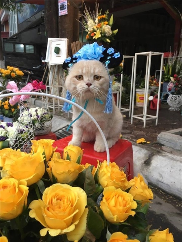 Ngay bên dưới bài đăng là một loạt những hình ảnh "bá đáo" không kém được chụp trước đây do các "fan cuồng" của chú mèo này đóng góp. Theo đó, chú mèo này đã từng "kinh doanh" nhiều mặt hàng phong phú, đa dạng như cá tươi, hoa tươi. Và lần nào đi bán cũng phải diện trang phục thật đáng yêu, “cute phô mai que” mới chịu!