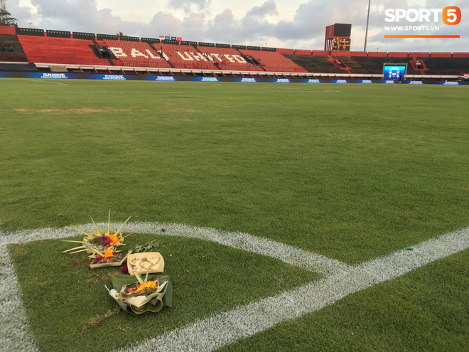 Hoa cúng được đặt tại sân vận động Kapten I Wayan Dipta (Bali, Indonesia) trước giờ diễn ra trận đấu giữa tuyển Indonesia và tuyển Việt Nam. Ảnh: Hiếu Lương.