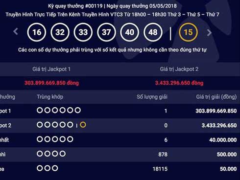 Tối 5/5, Vietlott xác định có 1 vé trúng Jackpot 1 với giá trị 303.899.669.850 đồng. Tấm vé này có 4 bộ số do khách hàng tự chọn, trong đó có bộ số 16-32-33-37-40-48 trùng với kết quả Jackpot 1. Vé may mắn được phát hành tại điểm bán hàng số 252 Vũ Hữu, phường Thanh Xuân Bắc, quận Thanh Xuân, Hà Nội.