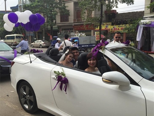 Đoàn rước dâu nổi bật với chiếc xe rước dâu mui trần được trang trí bằng bóng bay với 2 màu trắng, tím.