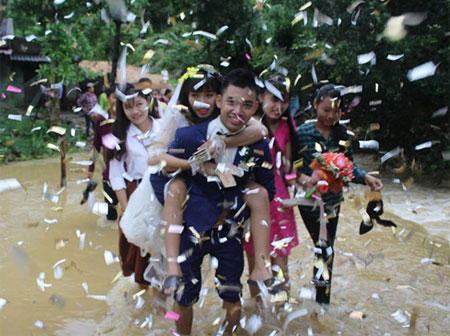 Tổ chức đám cưới đúng ngày mưa bão nhưng chú rể lại tỏ ra khá vui vẻ và không ngần ngại xắn quần, cõng cô dâu ra đường lớn.