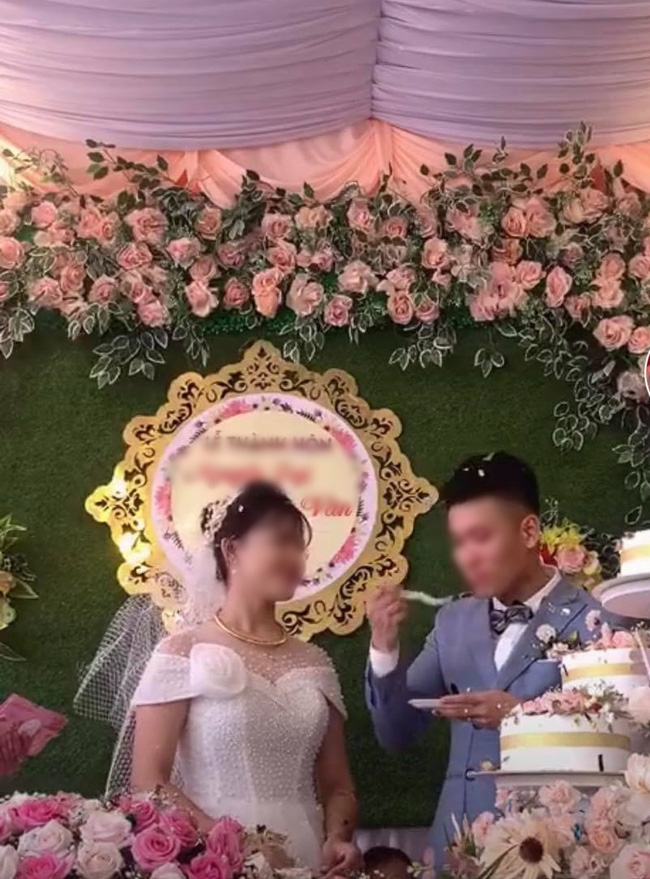 Theo đó, buổi lễ sắp xong xuôi, chú rể cắt bánh cưới. Anh cầm đĩa bánh định đút một miếng cho vợ. Tuy nhiên cô dâu từ chối luôn: "Không, em không ăn".