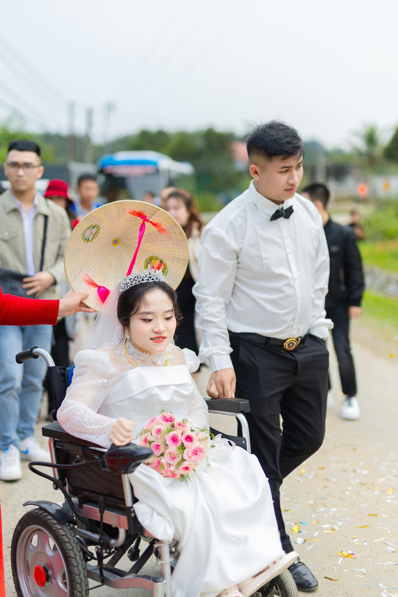 Chú rể dẫn đầu đoàn rước dâu khoảng 20 người từ Thanh Hóa vào Hà Tĩnh đón vợ. Khoảnh khắc cô dâu ngồi xe lăn cùng chú rể tiến vào lễ đường, cả hôn trường xúc động. Nhiều người rơi nước mắt mừng cho hạnh phúc của cặp đôi.