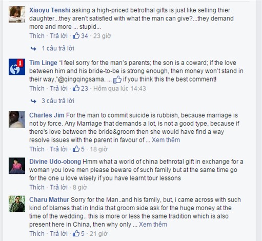 Tài khoản Charles Jim bình luận: "Đối với một người đàn ông, việc chấp nhận tử tự đúng là ngớ ngẩn, bởi lẽ hôn nhân không phải ép buộc. Bất kì cuộc hôn nhân nào cũng yêu cầu nhiều thứ, đó không phải là điều tốt, bởi nếu có tình yêu giữa cô dâu và chú rể thì cô sẽ tìm cách giải quyết vấn đề vẹn cả đôi đường với bố mẹ nhà gái"