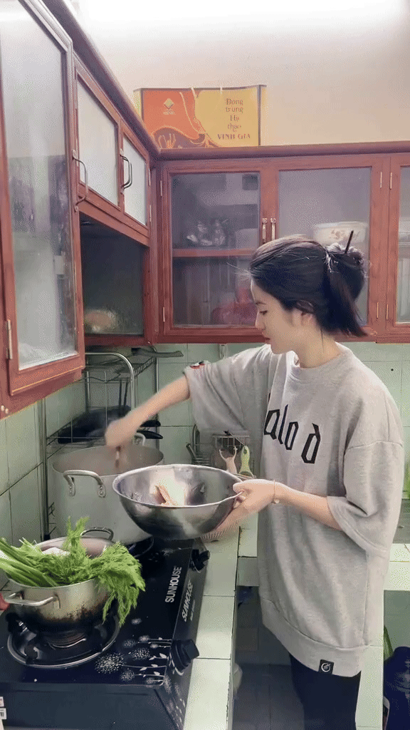 Chu Thanh Huyền vào bếp nấu ăn và khẳng định chắc nịch "Không lười thôi chứ việc gì cũng 'cân' được nha".