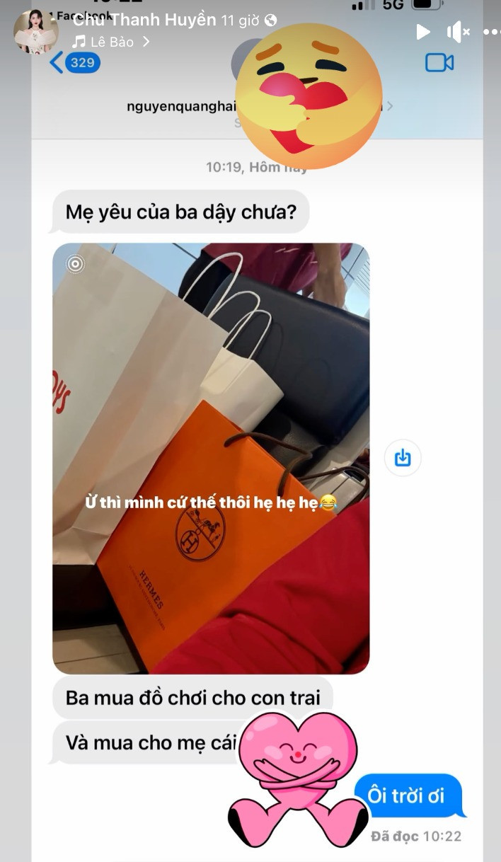 Trên trang cá nhân, nàng WAGs gốc Sơn Tây hạnh phúc khoe quà ông xã mua tặng, không giấu nổi niềm hạnh phúc. "Chồng đi công tác về là có quà cho bé con Lido, mẹ cháu cũng được ké hơi con trai xíu ạ", cô chia sẻ.