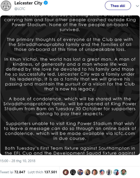 Đại diện Leicester City viết: "CLB đau lòng phải thông báo rằng chủ tịch của chúng tôi, ông Vichai Srivaddhanaprabha, là một trong những người thiệt mạng vào tối thứ bảy khi chiếc trực thăng chở ông cùng 4 người khác rơi bên ngoài sân vận động King Power. Không ai trong số 5 người họ sống sót".