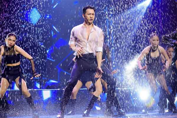 Còn ở tiết mục thứ hai, chủ tịch Trần Hùng Huy cởi bỏ áo khoác ngoài để có thể thoải mái hát, nhảy. Khoảnh khắc ấn tượng nhất của màn trình diễn là khi anh "tắm mưa" và "cháy" hết mình bên dàn vũ công.