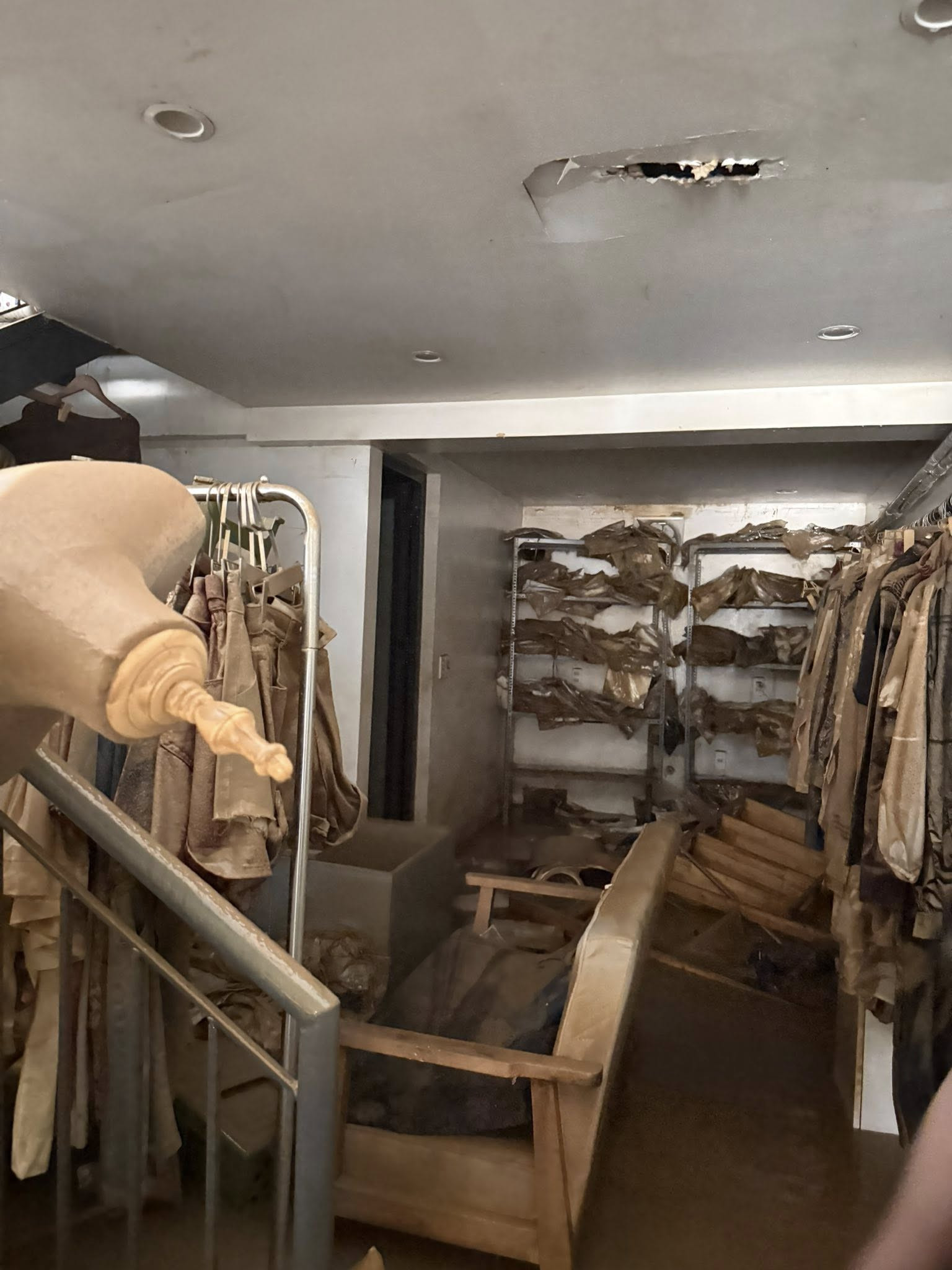Từ bức ảnh được chị Trang chia sẻ, có thể thấy rõ mức độ tàn phá khủng khiếp của trận lũ. Quần áo, túi xách và giày dép dính đầy bùn đất, ngổn ngang trên nền nhà. Các giá treo, kệ gỗ và thiết bị trang trí đều bị ngấm nước, cong vênh, hư hại. Dấu vết nước ngập vẫn còn in đậm trên tường, cao đến gần vai người lớn, minh chứng cho mực nước dâng cao bất thường.