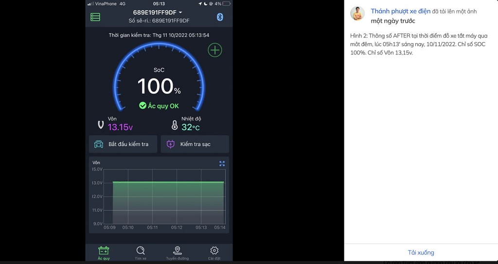 Có chủ xe còn kiểm tra ắc quy mới thay của VinFast với bài test của riêng mình. Chia sẻ trên diễn đàn chính thức của Cộng đồng VinFast toàn cầu, một thành viên sau khi mang xe tới xưởng dịch vụ VinFast Bình Phước đã cẩn thận chụp lại thông số kĩ thuật của hệ thống ắc quy trước và sau khi để qua đêm. Theo kết quả của người dùng này, sau cả đêm đỗ xe ngoài trời, mọi chỉ số của bộ ắc quy 12V mới vẫn đạt kết quả hoàn hảo 100%.