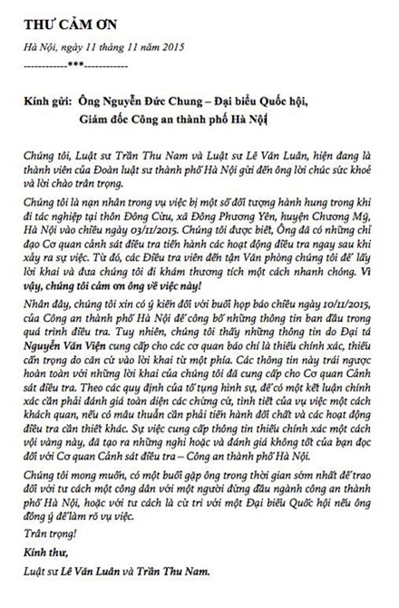 Sau khi Công An Tp Hà Nội họp báo thông tin về kết quả điều tra ban đầu của vụ hai luật sư bị hành hung ở Chương Mỹ - Hà Nội, các nạn nhân trong vụ việc này đã viết thư gửi giám đốc công an Hà Nội.