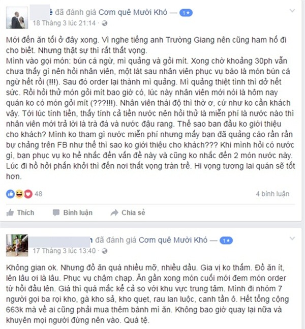 Tuy nhiên chỉ sau ít ngày ra mắt, quán cơm quê của Trường Giang liên tục khiến thực khách phải phàn nàn về giá cả "cắt cổ", được tiếng "cơm quê" nhưng mức giá lại ở thành phố.