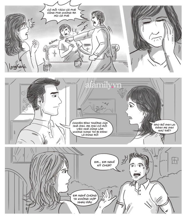 Bố anh không chăm sóc hay có cử chỉ quan tâm đến vợ. Khi mẹ anh nói điều gì đó không vừa ý, ông đập bàn quát thẳng chứ không kiêng nể sự có mặt của tôi. Mẹ anh sợ hãi, khép nép. Đỉnh điểm là khi mẹ anh pha ly cà phê đem ra nhưng lại bỏ nhiều sữa. Bố anh đập vỡ cả ly cả tách rồi thẳng tay giáng cho vợ một bạt tai. Tôi sững người, "chết trân" vì quá bất ngờ. Còn Tuấn, anh bình thản uống cà phê, còn thốt ra một câu: "Có gì mà em ngạc nhiên dữ vậy. Nhà anh vậy là bình thường".