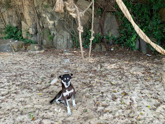| Chú chó tận hưởng không khí trong lành của Ghềnh Bàng dưới tán cây mát rượi và rất “hiếu khách”. Ảnh: Văn Thuận |