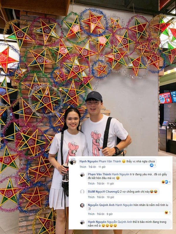 Vợ của tiền đạo Phạm Văn Thành - người cũ của Hà Nội FC - tag thẳng tên chồng và hờn dỗi: "Thấy vợ chồng nhà người ta chưa?". Đáp lại, anh chồng thẳng thắn rằng Duy Mạnh và Quỳnh Anh vẫn đang yêu mà, đã có giấy đăng kí kết hôn đâu mà gọi là vợ chồng. Câu chuyện của đôi vợ chồng trẻ được Quỳnh Anh góp vui bằng bình luận như xát muối vào lòng cô vợ: "Hôn nhân là nấm mồ của tình yêu".