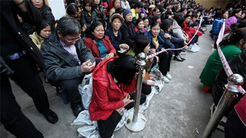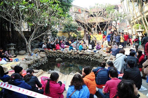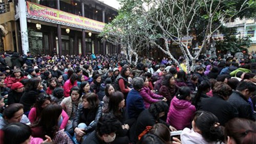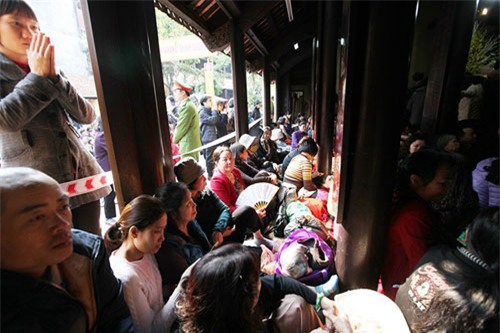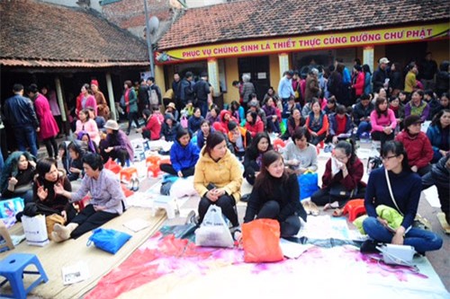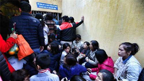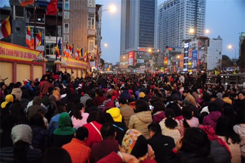 Càng về chiều lượng người càng đông, bắt đầu gây ùn tắc. Từ 17g chiều, cửa vào sân chùa đã đóng, tất cả những người chưa vào được bên trong sân chùa đều phải xếp hàng ngồi ngoài.