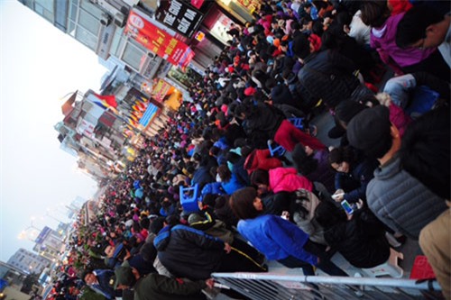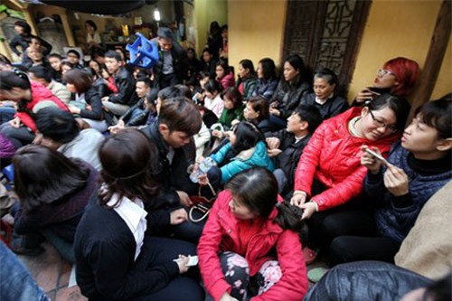 Đúng 19g tối 21/2 lễ cầu an ở chùa Phúc Khánh mới bắt đầu nhưng từ 14g chiều người dân đã đổ về đây. Họ mang theo cả đồ ăn, nước uống ngồi chờ mấy tiếng đồng hồ để giữ chỗ.