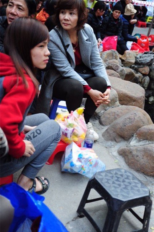 Người dân mang theo cả đồ ăn, nước uống vào ngồi chờ sẵn để giữ chỗ. |