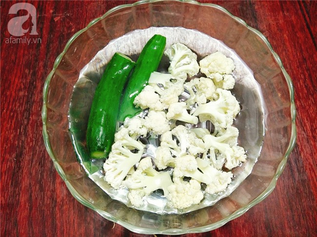 Dưa chuột, súp lơ đem rửa sạch sau đó cho vào bát nước muối loãng ngâm 15 phút thì vớt ra rửa lại thêm 1 lần nữa cho sạch.