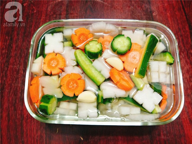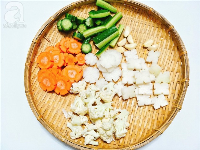 Cà rốt, củ cải đem nạo sạch vỏ rồi tỉa hình hoa thái miếng hơi dày 1 chút. Súp lơ đem tách thành các nhánh nhỏ vừa ăn. Su hào gọt vỏ rồi cũng đem tỉa hoa nếu thích và thái miếng dày như cà rốt. Tỏi bóc sạch vỏ để nguyên tép hoặc thái lát mỏng tùy thích. Dưa leo để nguyên vỏ để dưa có độ giòn, tỉa hoa hoặc thái khúc chẻ làm 4.