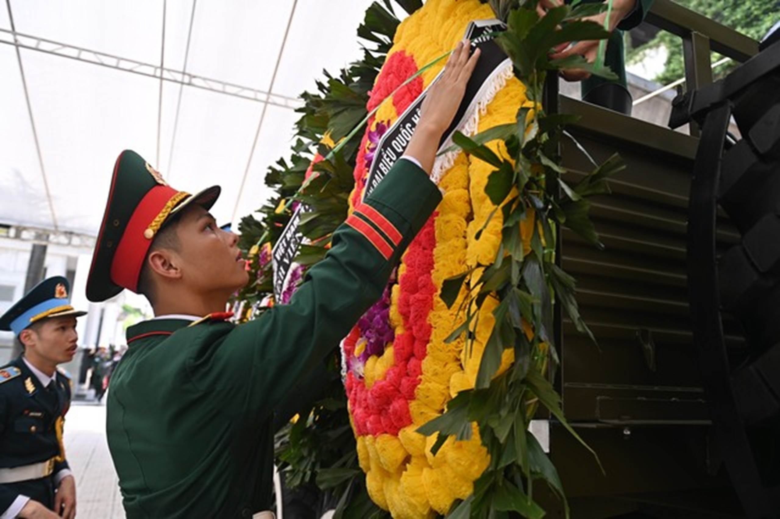 Các vòng hoa kính viếng đã được di chuyển ra các xe trong đoàn xe tang