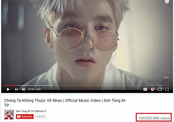 Trong thời điểm nóng khi mà Nơi này có anh “song kiếm hợp bích” cùng Lạc trôi “làm mưa làm gió” Vpop suốt những ngày qua, lập “hàng tá” thành tích, kỉ lục khủng thì Sơn Tùng và đại gia đình Sky lại tiếp tục đón nhận tin vui từ Chúng ta không thuộc về nhau. MV này đã chính thức trở thành MV đầu tiên của nam ca sĩ cán mốc 100 triệu lượt xem trên Youtube.