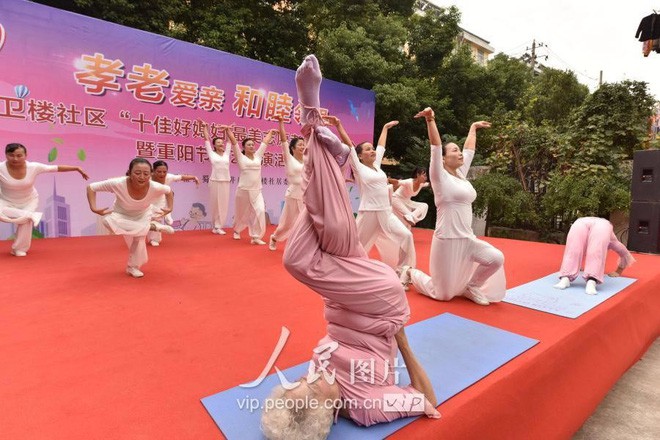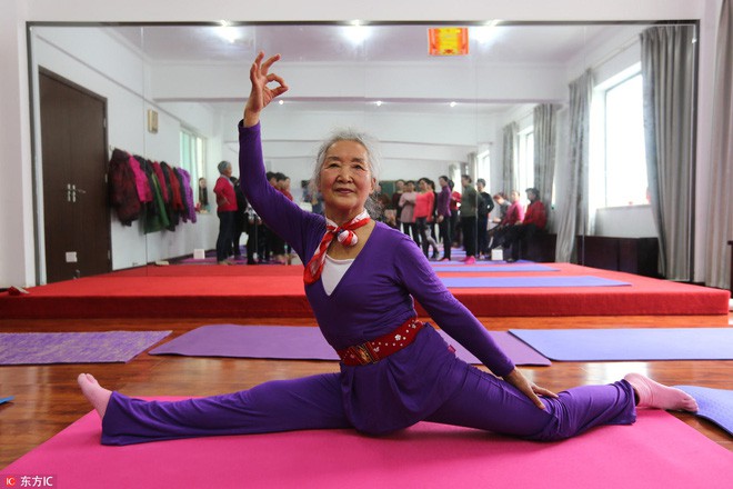 Cụ bà Nhạc Cảnh Hà, 82 tuổi, sống ở An Huy đã từng biểu diễn yoga với những động tác khó khiến ai cũng phải nể phục. Bà Nhạc luôn tích cực tham gia các hoạt động thể thao trong khu vực và giúp đỡ những người lớn tuổi khác cùng tập luyện. (Ảnh: Internet)