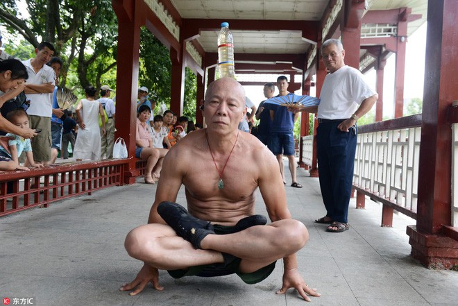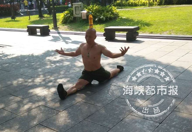 Chú Lâm Kim Lượng, 58 tuổi ở Phúc Châu từng khiến người dân xung quanh ngỡ ngàng khi thực hiện động tác yoga với thử thách giữ cho chai nước trên đỉnh đầu không rơi xuống đất. (Ảnh: Internet)