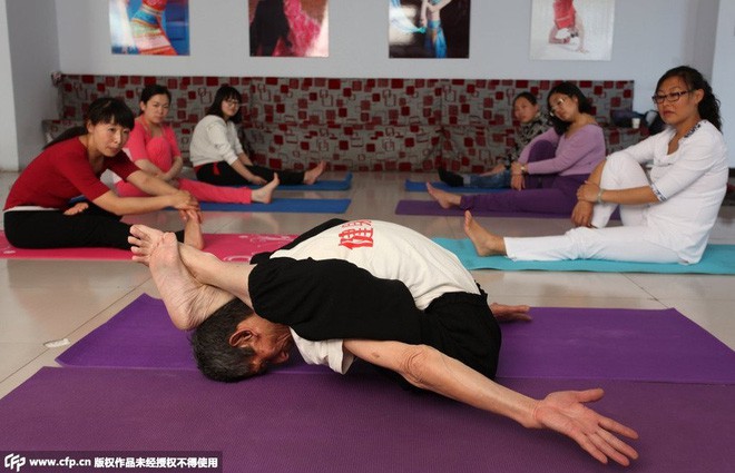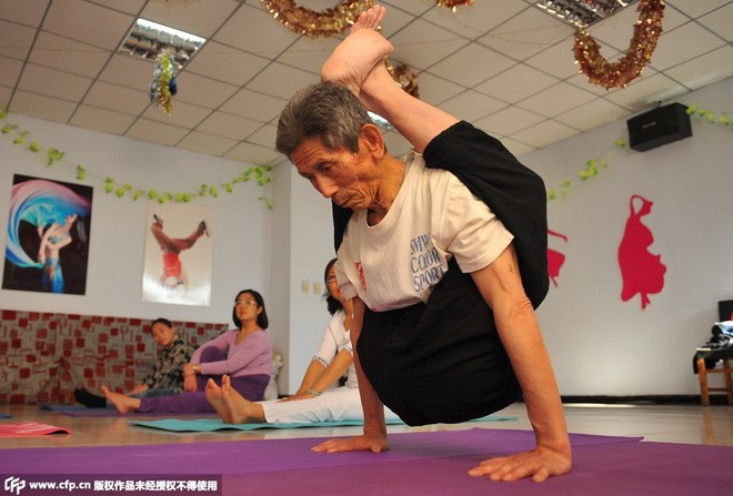 Cụ ông Hầu Chấn Sơn, 84 tuổi ở Hà Bắc đã biểu diễn một tư thế yoga cực khó trong buổi sinh hoạt thể thao trong khu phố khiến ai cũng trầm trồ. Cách đây 30 năm, ông Hầu từng bệnh rất nặng, tưởng chừng như không thể qua khỏi, nhưng từ khi ông tiếp cận với môn yoga thì sức khỏe dần cải thiện và giờ đây ông có một cơ thể dẻo dai không khác những người trẻ tuổi. (Ảnh: Internet)