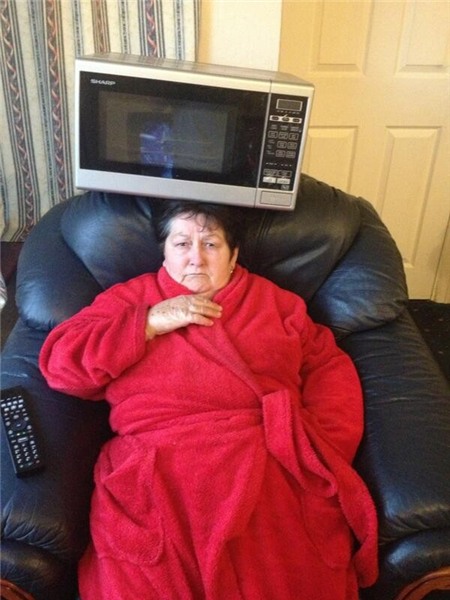 Cụ bà Jean Noakes 70 tuổi, đến từ Manchester vui vẻ cho cháu mình Jamie, 18 tuổi chụp ảnh để đăng lên mạng. Trang Twitter mà Jamie đăng ảnh bà nội giữ thăng bằng đồ vật có tới 12.000 người đăng ký theo dõi.
