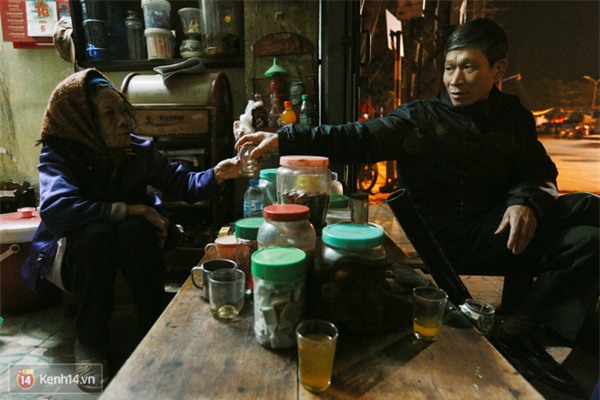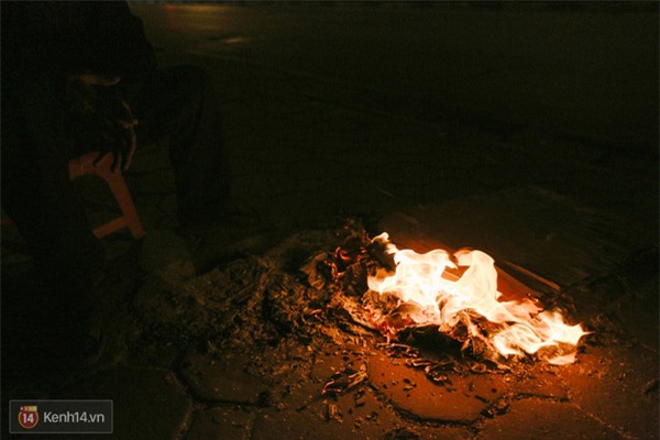 2h sáng, cụ Hải (80 tuổi) sưởi ấm bên ngọn lửa trước hiên nhà. Ông Hải chia sẻ vợ chồng ông bán trà đá trên phố Tôn Đức Thắng cũng cả chục năm rồi. Đêm đến, ông thường khó ngủ nên lại thức bán thêm cho đêm đỡ dài.