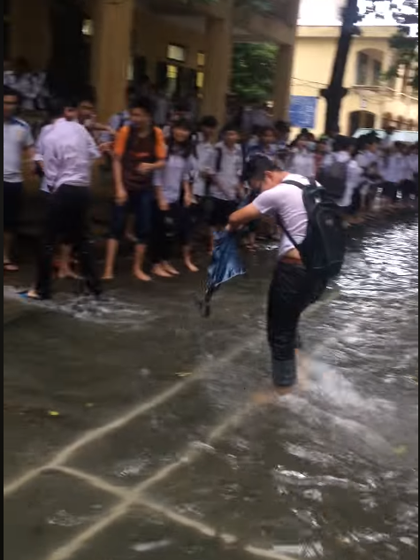 Mưa xuống, trường ngập, người thì tranh thủ tắm mưa, kẻ thì quậy phá tạt nước bạn bè, kẻ thì tranh thủ hứng nước mưa để dùng.