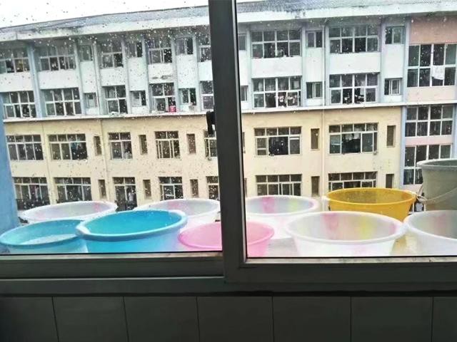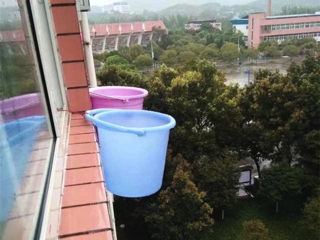 Tất cả xô chậu trong ký túc xá đều được tập trung về để hứng nước mưa