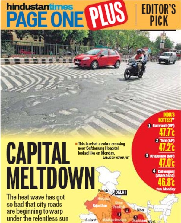 Theo báo chí địa phương, do nhiệt độ ngoài trời quá cao nên các tuyến đường ở New Delhi đã tan chảy, biến dạng. Hình ảnh mặt đường biến dạng do nắng nóng hiện đang được rất nhiều tờ báo địa phương và quốc tế đăng tải nhằm thể hiện tình hình thời tiết khắc nghiệt ở quốc gia này. Trong đó, tờ Hindustan Times đã đăng tải hình ảnh này lên trang nhất với tiêu đề "Thủ đô tan chảy".