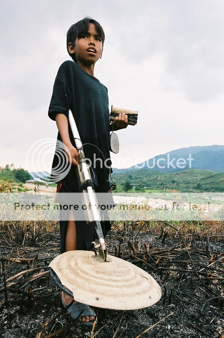Với mỗi gia đình ở thôn Kà Cú, chiếc máy dò miểng bom trở thành tài sản quý như đồ gia bảo. Em Hồ Văn Cuồng đang thu hoạch miểng bom bằng loại dụng cụ này.