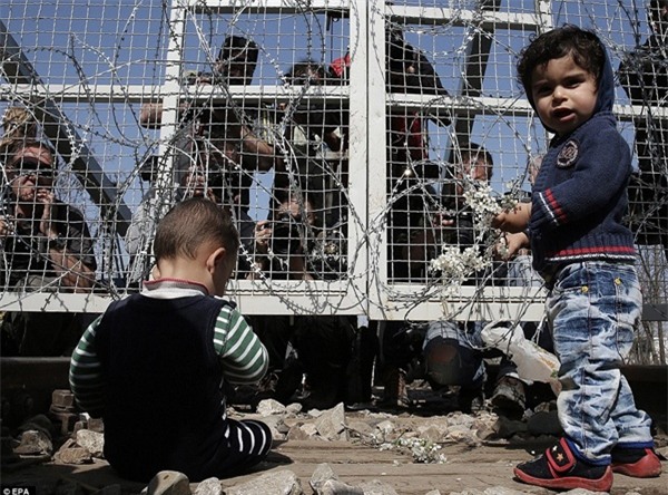 Hình ảnh các em bé phải đứng sau hàng rào không còn hiếm tại trại Idomeni.