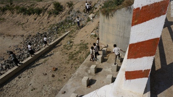 Một đập thuỷ điện cạn khô, các em nhỏ chơi đùa ngay bên dưới con đập.