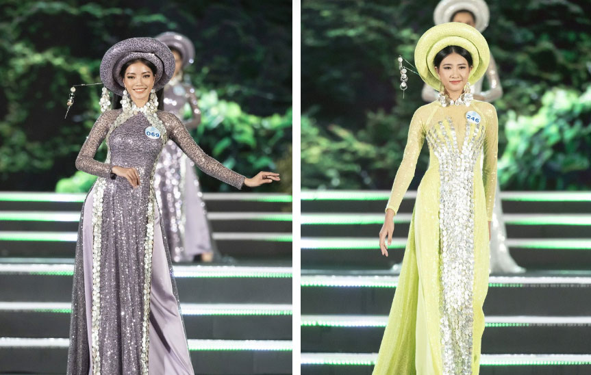 Một số thí sinh lại có dịp phô trương sắc vóc với kiểu áo dài đính sequin nặng trình trịch.