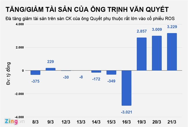 Cụ thể, tính từ đầu tuần này (19/3), khối tài sản trên sàn chứng khoán của ông Quyết đã tăng gần 9.100 tỷ, trong đó riêng ngày 21/3, tăng thêm tới 3.229 tỷ đồng.