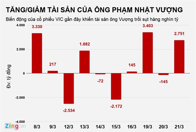 Trước đó, những biến động của VIC trong tuần trước cũng khiến tài sản của vị tỷ phú này trồi sụt hàng nghìn tỷ đồng. Hiện ông Vượng sở hữu lượng cổ phiếu VIC có giá thị trường lên tới 78.188 tỷ đồng, xấp xỉ 3,44 tỷ USD. Số tài sản này tương đương gần 60% tài sản ròng mà vị tỷ phú này sở hữu theo thống kê mới nhất từ Tạp chí Forbes.