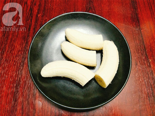 Chuối đem lột vỏ sau đó cắt chuối làm đôi theo chiều ngang quả chuối, để ra đĩa.