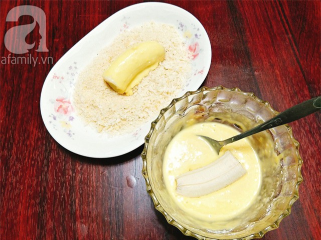 Đặt chảo dầu lên bếp đun cho dầu nóng sau đó bạn lấy 1 miếng chuối nhúng vào tô bột ướt rồi cho vào bát bột chiên xù, lăn đều cho chuối bám 1 lớp bột xù.