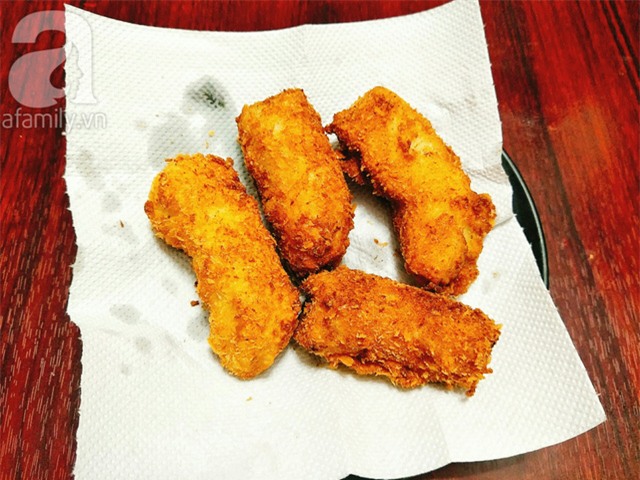 Cho chuối vào chảo dầu chiên tới khi chuối vàng giòn đều thì vớt ra đĩa có lót sẵn giấy thấm dầu và thưởng thức chuối chiên xù khi còn nóng.