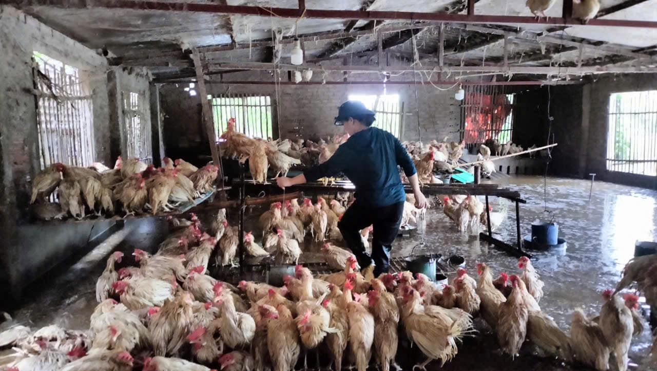 Do nhà chị nuôi gà ở khu vực bãi nên khi nước lên, khu chăn nuôi nhà chị bị ngập hết. Nhà chị đã phải sử dụng thuyền để di chuyển gà vào khu vực cao. Đàn gà nhà chị khoảng 4.000 con, tất cả đều trong độ tuổi sinh sản. Số lượng gà nhiều, diện tích chứa lại nhỏ nên chị khá lo lắng về việc gà chết sẽ bị thua lỗ.