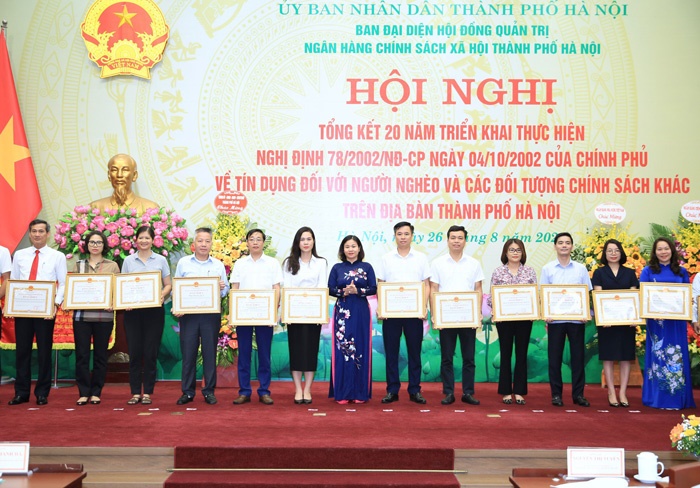 Nhân dịp này, Ban Chấp hành Đảng bộ Thành phố Hà Nội tặng bức trướng chúc mừng những thành tựu mà Chi nhánh NHCSXH Thành phố Hà Nội đã đạt được trong chặng đường 20 năm qua. UBND Thành phố Hà Nội tặng bằng khen của Chủ tịch UBND Thành phố cho cho 40 tập thể, 59 cá nhân và 1 hộ gia đình vay vốn có thành tích xuất sắc, tiêu biểu trong thực hiện Nghị định số 78/2002/NĐ-CP ngày 4/10/2002 của Chính phủ về tín dụng đối với người nghèo và các đối tượng chính sách khác trên địa bàn TP Hà Nội.