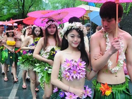 20 cặp đôi trẻ không mặc quần áo mà chỉ lấy hoa lá quấn quanh người để tổ chức đám cưới.