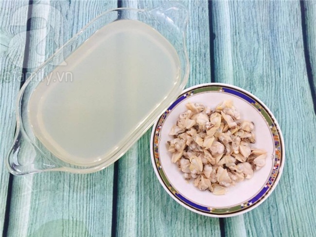 Nước luộc ngao lọc bỏ cặn, giữ phần nước trong.