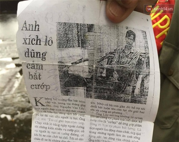 Tờ giấy tuy đã cũ, nhưng nội dung vẫn còn rõ ràng: "Không kể những lần bắt trộm cắp vặt trước đây, ông Nguyễn Văn Luỹ - một người đạp xích lô nhỏ thó, nhanh nhẹn đã 4 lần bắt cướp trả lại tài sản cho người bị hại. Ông Luỹ nói: "Tôi rất ghét bọn trộm cướp. Chạy xích lô ngoài đường hàng ngày tôi chứng kiến nhiều vụ cướp giật. Tôi có đứa cháu bị chúng đập đầu rồi cướp xe. Mất của ai không sót nhưng nhiều khi lại mang thương tật suốt đời...Ông Luỹ vừa được Đảng uỷ, UBND, Uỷ ban mặt trận tổ quốc quận 5 biểu dương tại hội nghị "Người tốt việc tốt" - trích bài viết của nhà báo Lê Anh Vũ.